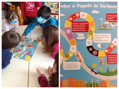 Sob o tema "Poupar Energia e Preservar o Ambiente" fizeram a observação e exploração das imagens do Jogo da Memória – Pegada de Carbono. Realizaram também todas as fichas de atividades propostas na maleta (colorir, completar, entre outras) ao longo das semanas.
