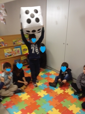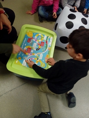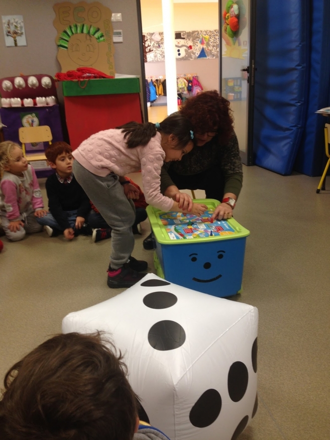 Na dinamização do Jogo da Glória - “Reduz a Pegada de Carbono” formaram-se 4 equipas em cada sala, e jogaram ao jogo de tabuleiro usando o dado gigante insuflável.